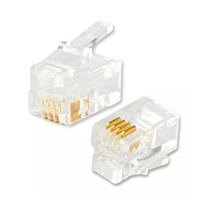 El RJ-11 es el conector utilizado en las redes de telefonía. Se refiere exactamente al conector que se une al cable telefónico y tiene 6 posiciones con 4 contactos centrales por los 4 hilos del cable telefónico, aunque normalmente se usan sólo dos (los dos centrales).